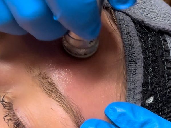 The HydraBrasion treatment exfoliates and extracts using a diamond tip dermabrasion. Simultaneously, dead skin cells are suctioned and transported into a waste container.